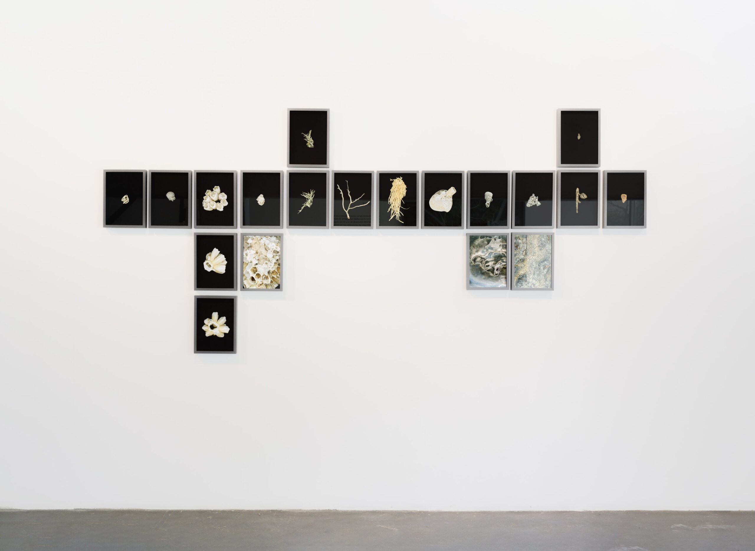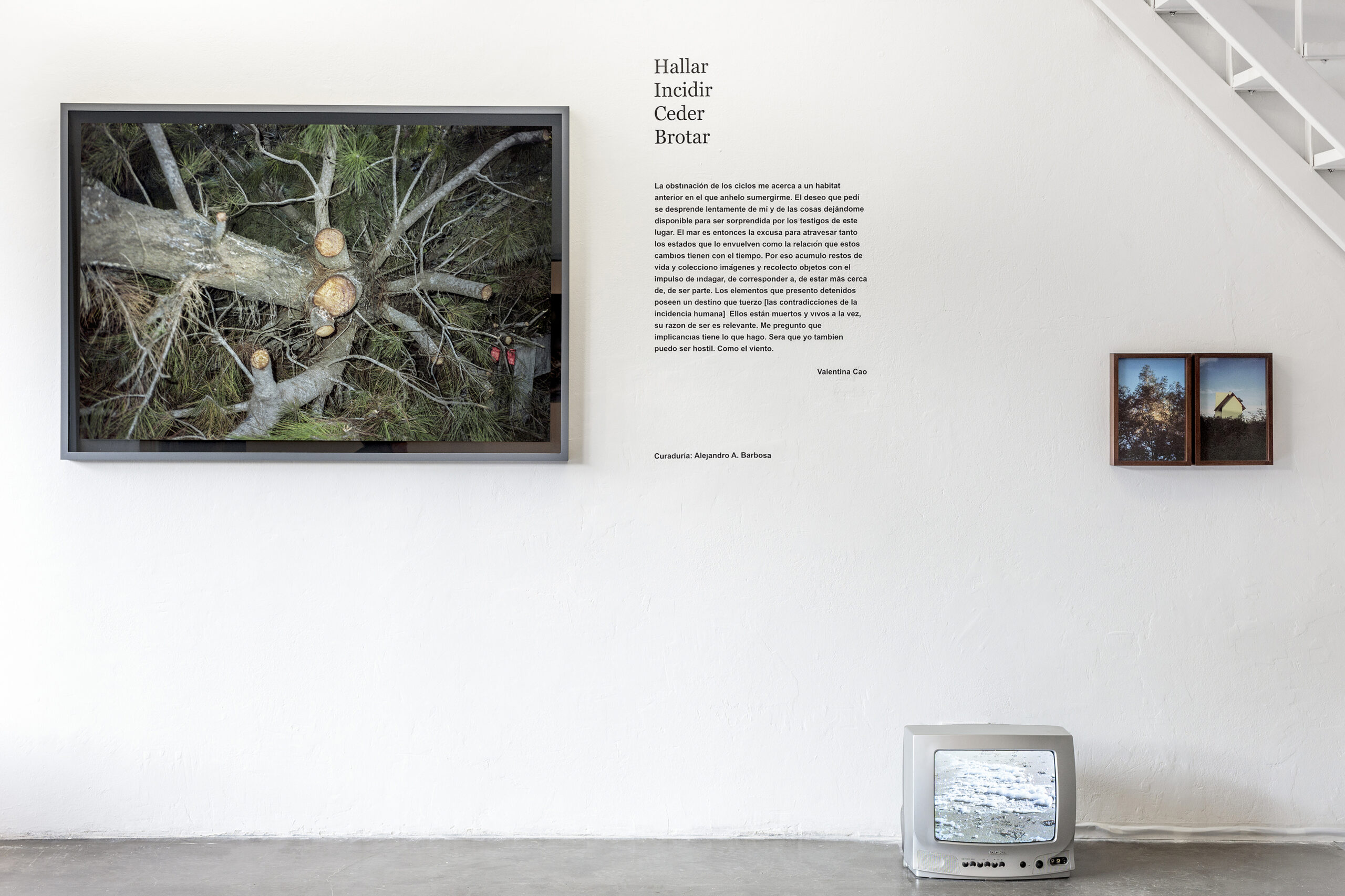 El proceso de producción se centra en el caminar y el hábito como las estrategias que la artista elige para acceder al espacio estético (en) que el proyecto (se) desarrolla. Las expediciones diarias de la artista resultan en la recolección de restos, ya sea físicos o en forma de imágenes fijas y videos. Frente a su colección de objetos e imágenes alejadas de su contexto original, Valentina organiza y configura relaciones que no se experimentan de manera directa salvo en su obra. Por eso nos presenta un inventario de restos de seres vivos y minerales en una grilla que remite a la tabla periódica de los elementos químicos. Esta referencia a la tabla podrá señalar un tiempo común entre los objetos, o la intención de construir un instrumento de navegación propio para orientarse en el nuevo lugar en función de la identificación y organización de sus testigos elementales. Esta aproximación podrá sugerir que Valentina suscribe a la supuesta neutralidad del discurso científico; incluso habrá quienes piensen que lo hace con la intención de capitalizarla y evadir los problemas éticos que nos impone vivir en la catástrofe planetaria en curso. Por el contrario–y como lo indica implícitamente la ausencia de la coma en el título el proyecto–hallar indefectiblemente implica incidir. Y el tono de esa incidencia lo marca la fotografía del árbol talado y… ¿hallado?